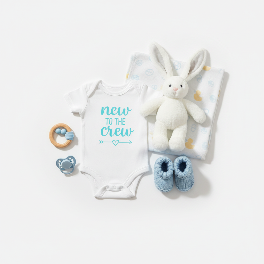 This charming bundle features a soft blue bunny toy and 'New to the Crew' onesie - the perfect combination for celebrating a new baby boy. Ideal for baby showers, hospital gifts, or welcoming your own precious bundle of joy.