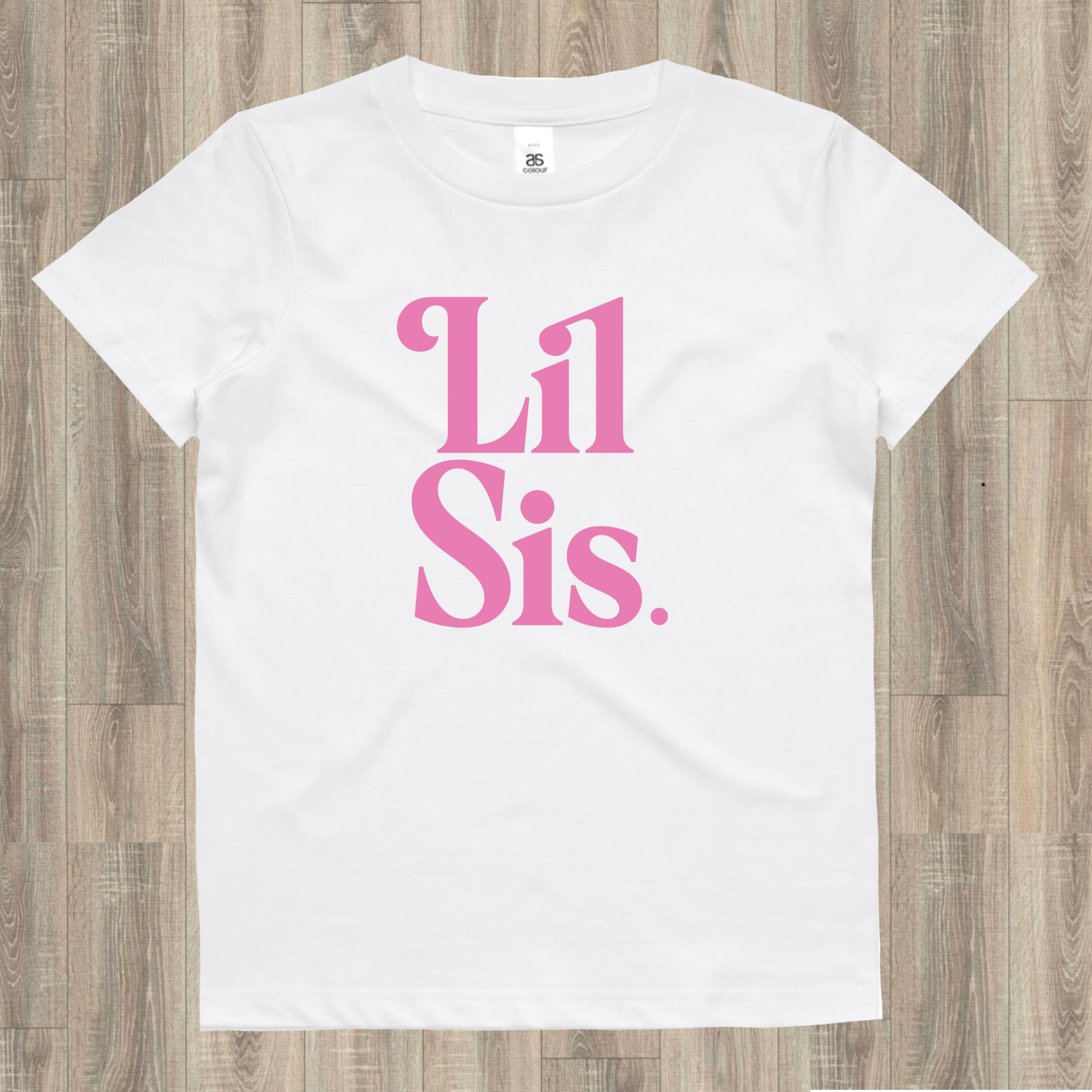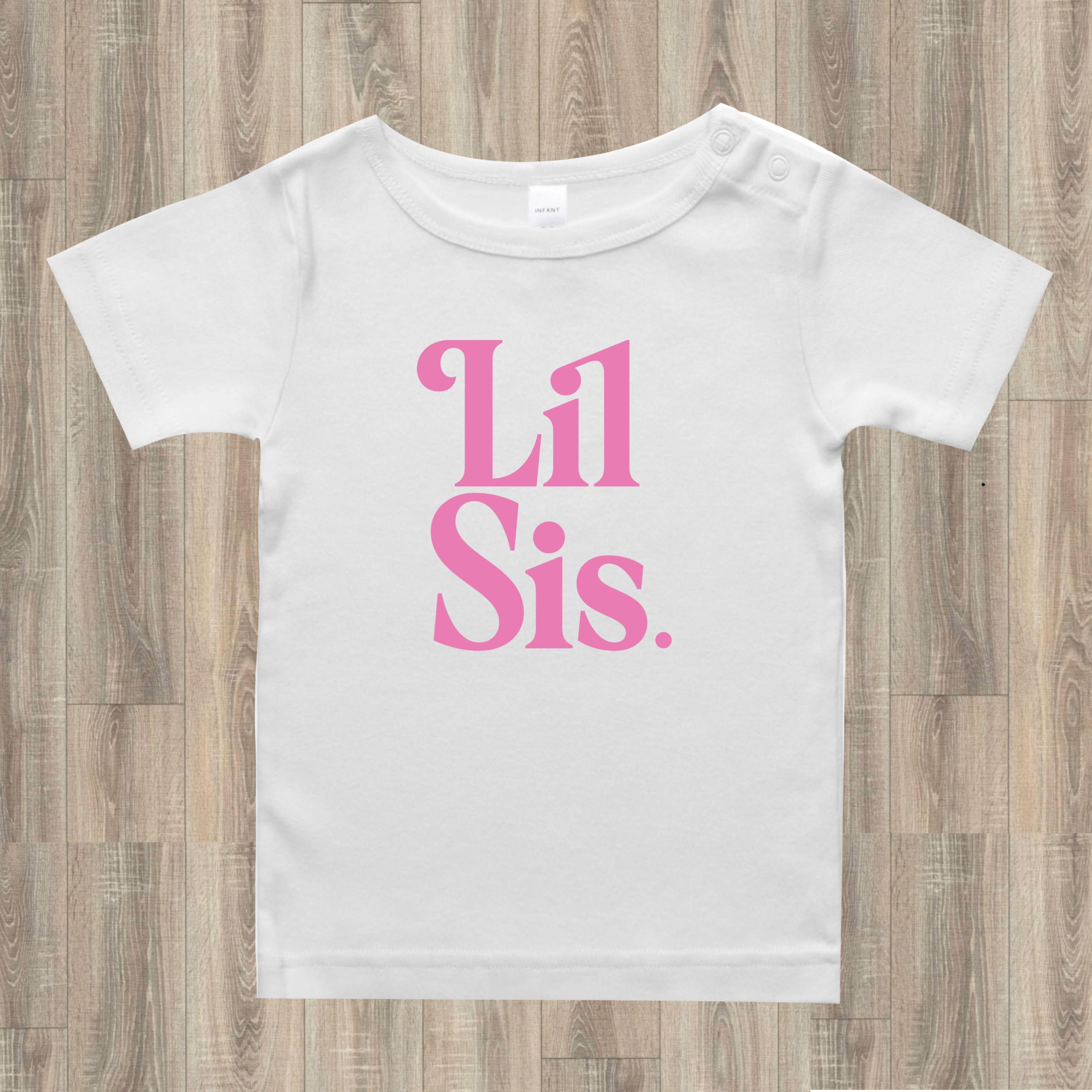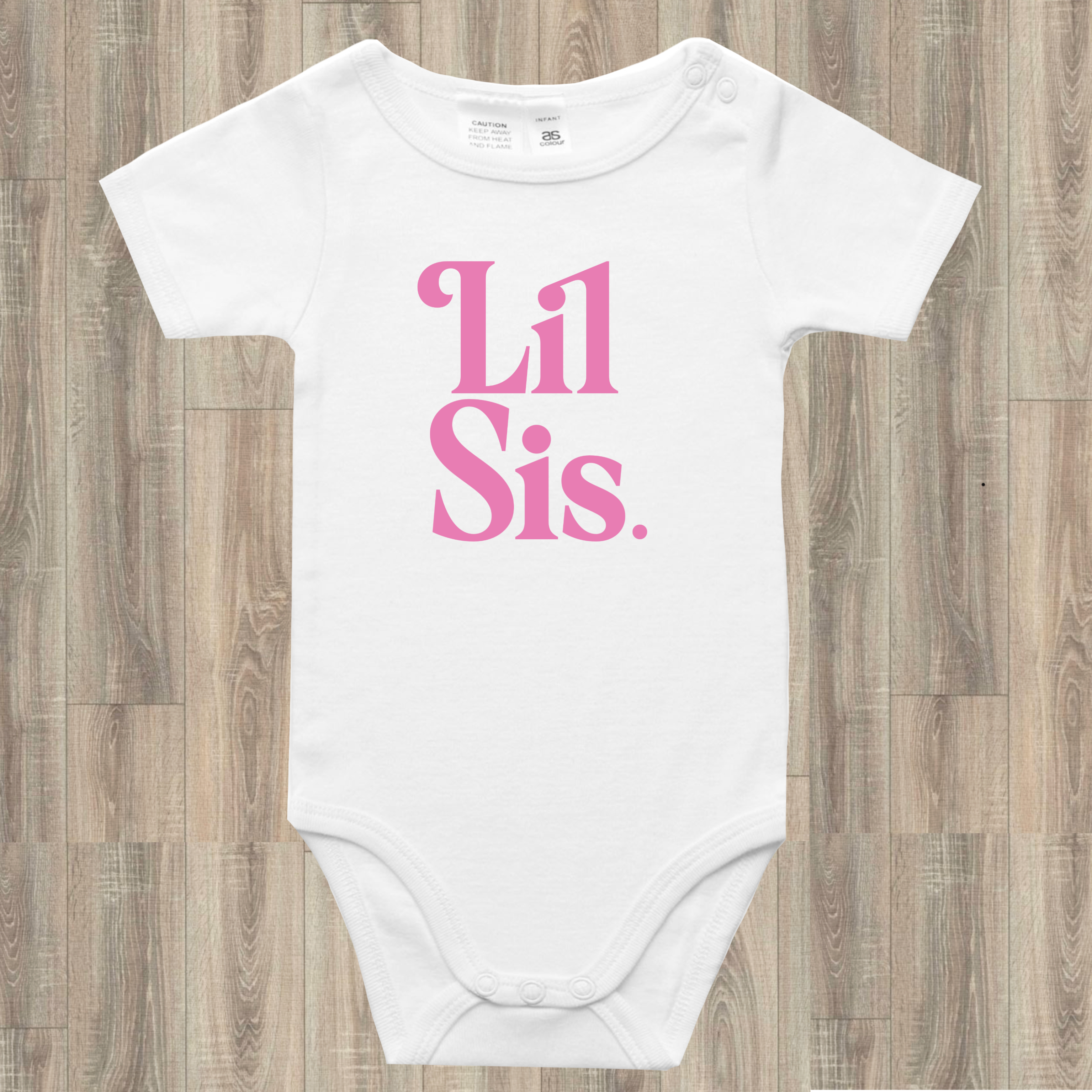 Lil Sis onesie, tee or toddler tee. Looks great with our matching “Big/ Lil Bro” or “Big Sis” tee!