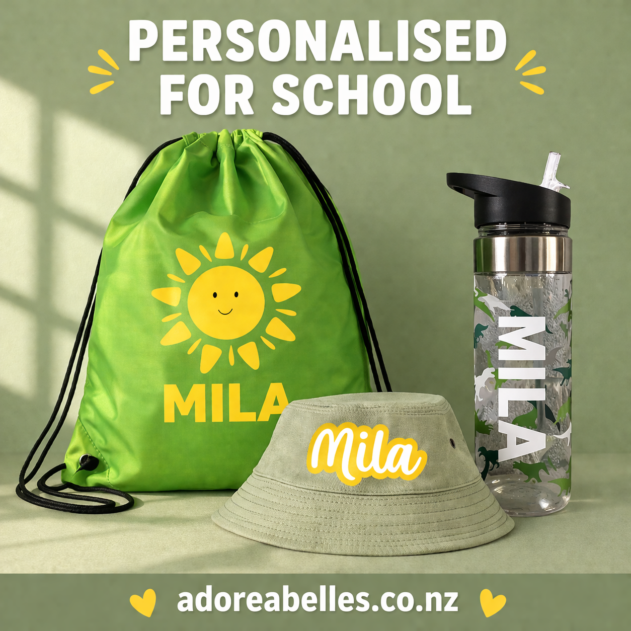 Personalised Kids Swim Bundle NZ – Green Bag, Bottle & Hat Set