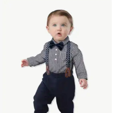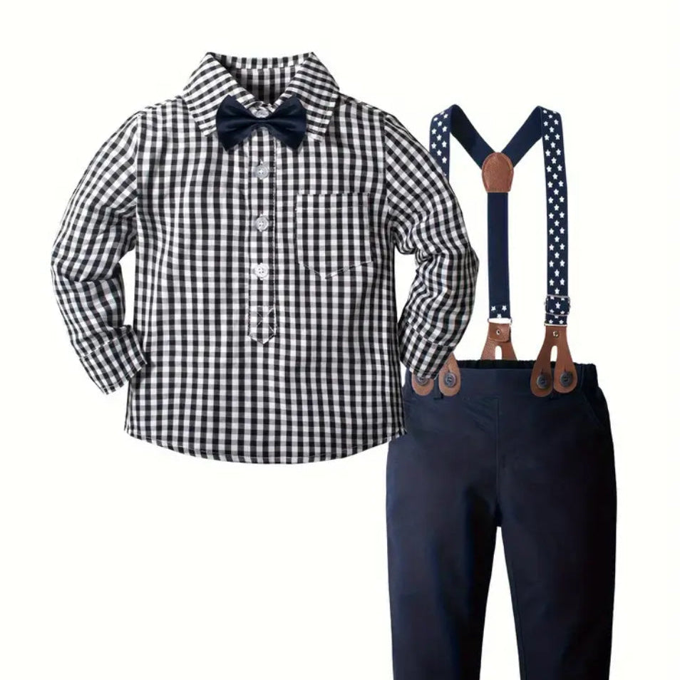 Boys Formal Outfit - Black Checked Shirt, Black Pants, Bowtie & Suspenders