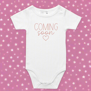 Introducing Coming Soon Onesie - the perfect way to share the news of a new sibling or upcoming bundle of joy.